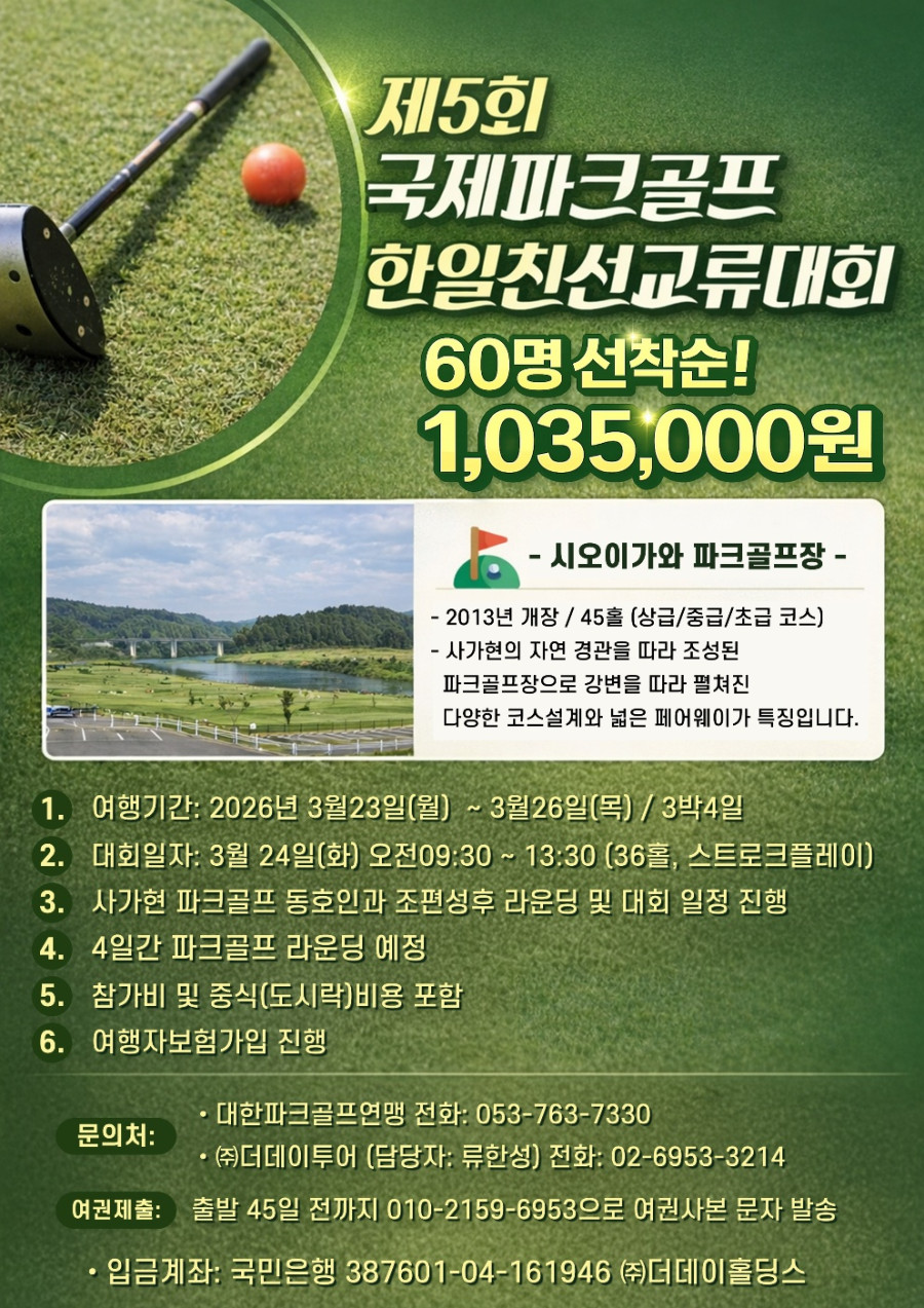 공지사항 2026 국제파크골프 한일친선 교류대회 작성자 : 최고관리자 작성일 : 25-12-26 15:15 조회수 : 413회 접수기한은 2026.1.20(화)까지입니다. 많은 관심 부탁드립니다. 다음글 제1회보람그룹배전국파크골프대회 시상자 25.12.26 이전글 새해인사 25.12.31 목록