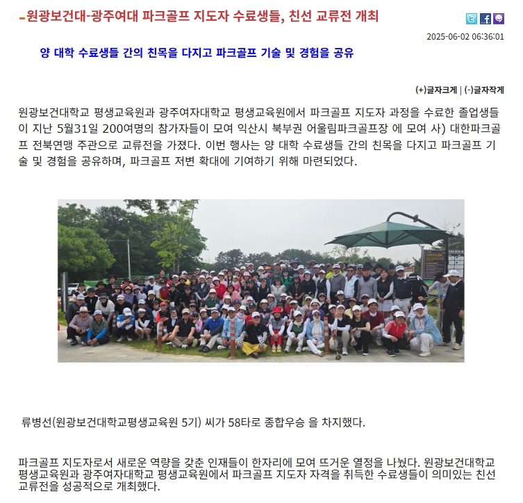 뉴스보도 광주 전북파크골프지도자 친선대회 작성자 : 최고관리자 작성일 : 25-09-24 03:53 조회수 : 243회 1 다음글 영남일보 인터뷰 25.09.10 이전글 한국의 파크골프발자취를 찿아서 25.11.27 목록