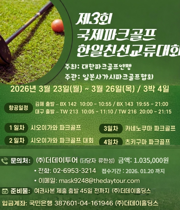 공지사항 제3회 일본 국제파크골프한일친선대회 작성자 : 최고관리자 작성일 : 25-12-26 15:15 조회수 : 3회 1 다음글 제1회보람그룹배전국파크골프대회 시상자 25.12.26 목록