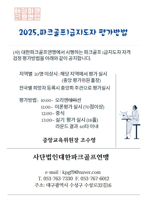 공지사항 파크골프1급지도자자격시험안내 작성자 : 최고관리자 작성일 : 25-08-14 00:15 조회수 : 2,101회 (사)대한파골프연맹 1급지도자 자격시험안내 다음글 생활스포츠2급지도사연수교육지정단체 25.08.12 이전글 2025년도 대구시의회 공공파크골프장의 운영 효율화를 위한 간담회 개최 25.08.19 목록