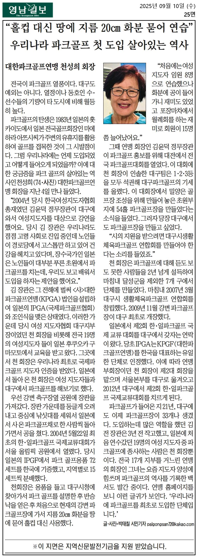 뉴스보도 영남일보 인터뷰 작성자 : 최고관리자 작성일 : 25-09-10 11:34 조회수 : 315회 2025년 09월 10일 대한파크골프연맹 천성희회장님과 영남일보만남으로 인터뷰가 진행되었습니다. 다음글 2023 스포츠복지경영학과 성인반 모집 22.10.18 이전글 광주 전북파크골프지도자 친선대회 25.09.24 목록